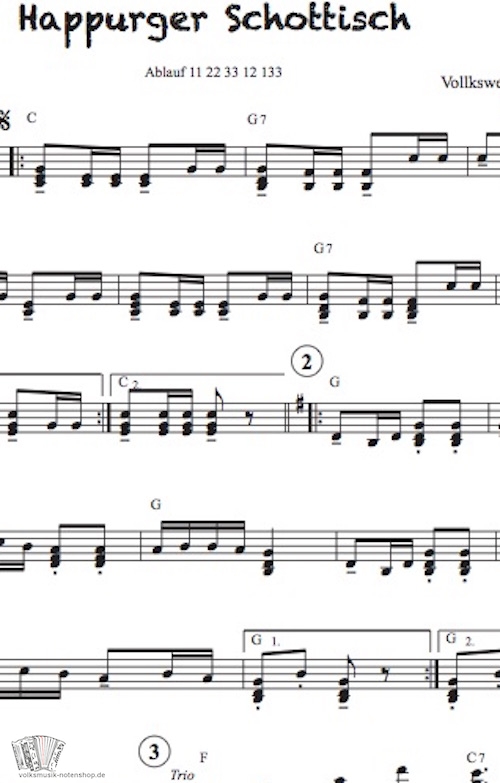 Happurger Schottisch, Volksweise aus Mittelfranken als Akkordeon-Version in C-Dur zum Download.