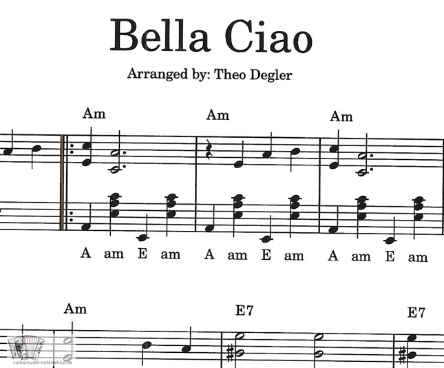 Bella Ciao - ital. trad. Volkslied - Arr. v. Theo Degler für Akkordeon mit Harmonieangaben