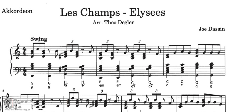 Les Champs Elysees - v. Joe Dassin, Arr. v. Theo Degler für Akkordeon mit Harmonieangaben