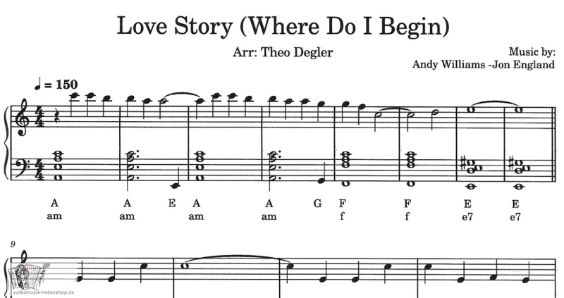 Love Story (Where do I begin) - Arr. v. Theo Degler für Akkordeon mit Harmonieangaben