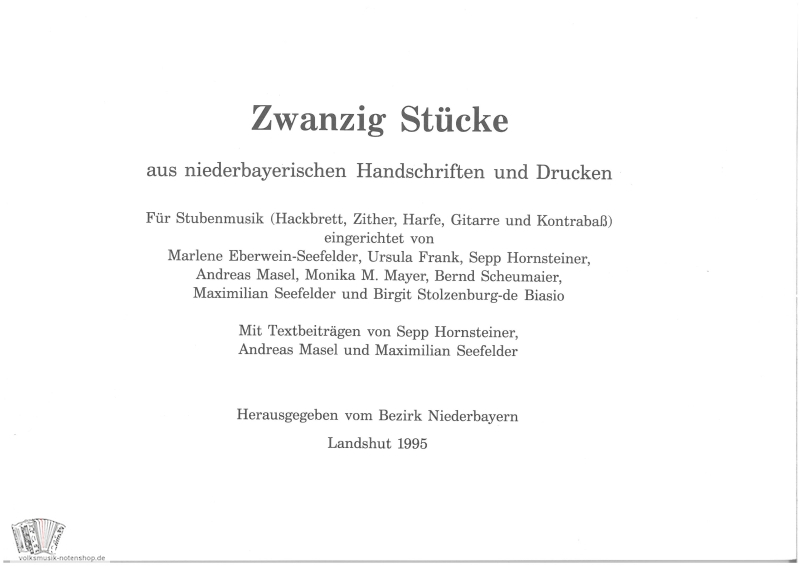 Für Stubenmusik (Hackbrett, Zither, Harfe, Gitarre und Kontrabass) eingerichtet von Marlene Eberwein-Seefelder, Ursula Frank, Sepp Hornsteiner, Andreas Masel, Monika M. Mayer, Bernd Scheumeier, Maximilian Seefelder und Birgit Stolzenburg-de Biasio. Mit Textbeiträgen von Sepp Hornsteiner, Andreas Masel und Maximilian Seefelder,