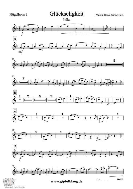 "Glückseligkeit" - Konzertpolka von Hans Krinner, für große Besetzung, mit vielen Facetten in allen Registern, zum Download.
